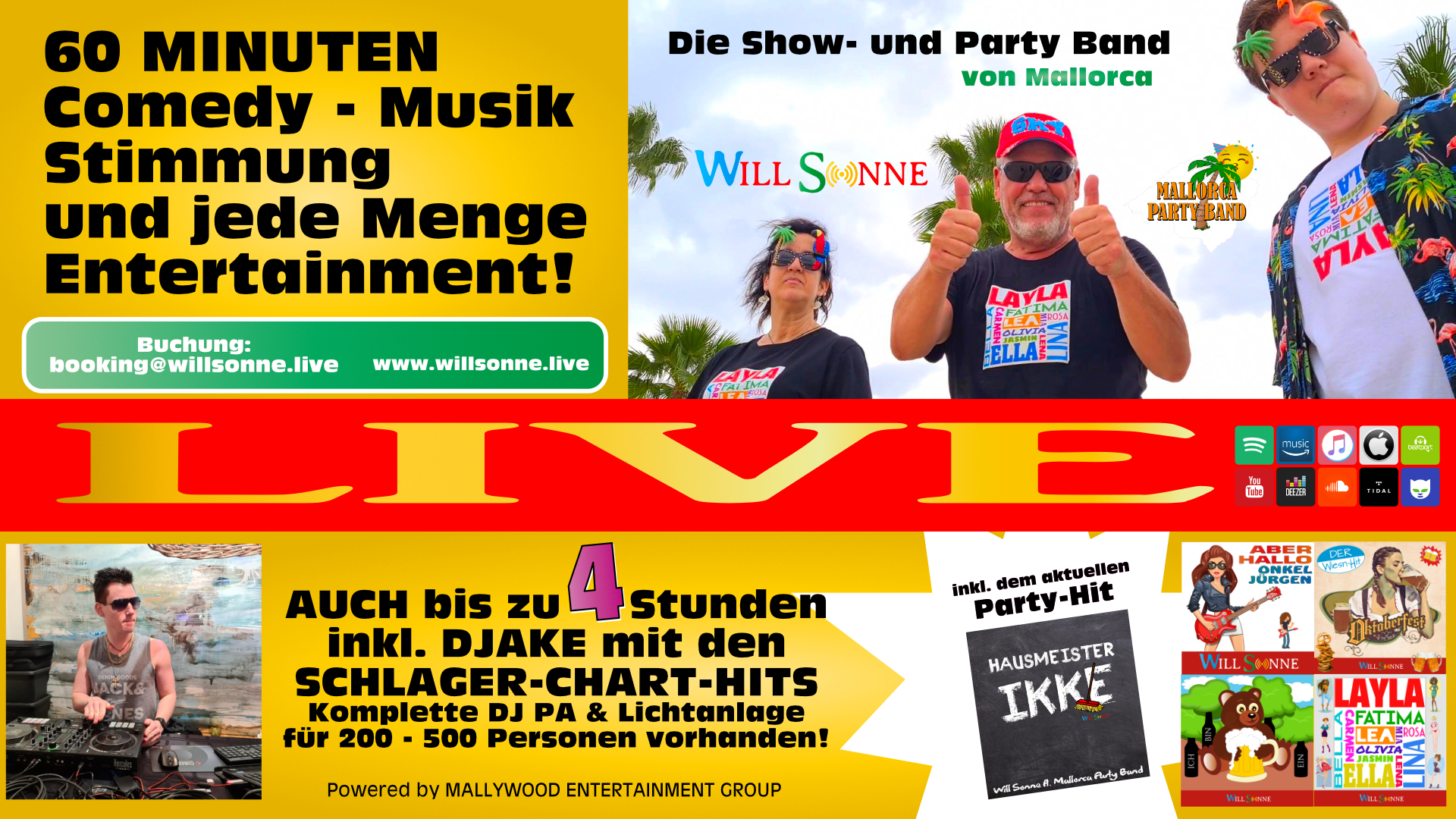 Zusammen mit der Mallorca Party Band und als Teil der Party Band ´ZICKE ZACKE´, die die neue Musikrichtung Promille Pop entwickelte und diese auch in ihrem ersten Titel besingt ist Will Sonne sowohl auf Mallorca aber auch für Deutschland und Österreich buchbar. Email an: booking@willsonne.live